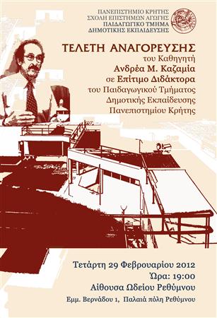 Το Παιδαγωγικό Τμήμα Δημοτικής Εκ̟αίδευσης του Πανε̟ιστημίου Κρήτης αναγορεύει τον Καθηγητή Ανδρέα Καζαμία, σε Ε̟ίτιμο Διδάκτορα του Τμήματος την Τετάρτη 29 Φεβρουαρίου 2012 και ώρα 19:00, στην αίθουσα του ωδείου Ρεθύμνου (Τζαμί Νερατζέ), στο Ρέθυμνο.