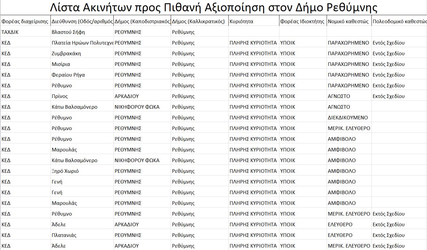 Λίστα με πιθανά ακίνητα προς πώληση στο Δήμο Ρεθύμνης