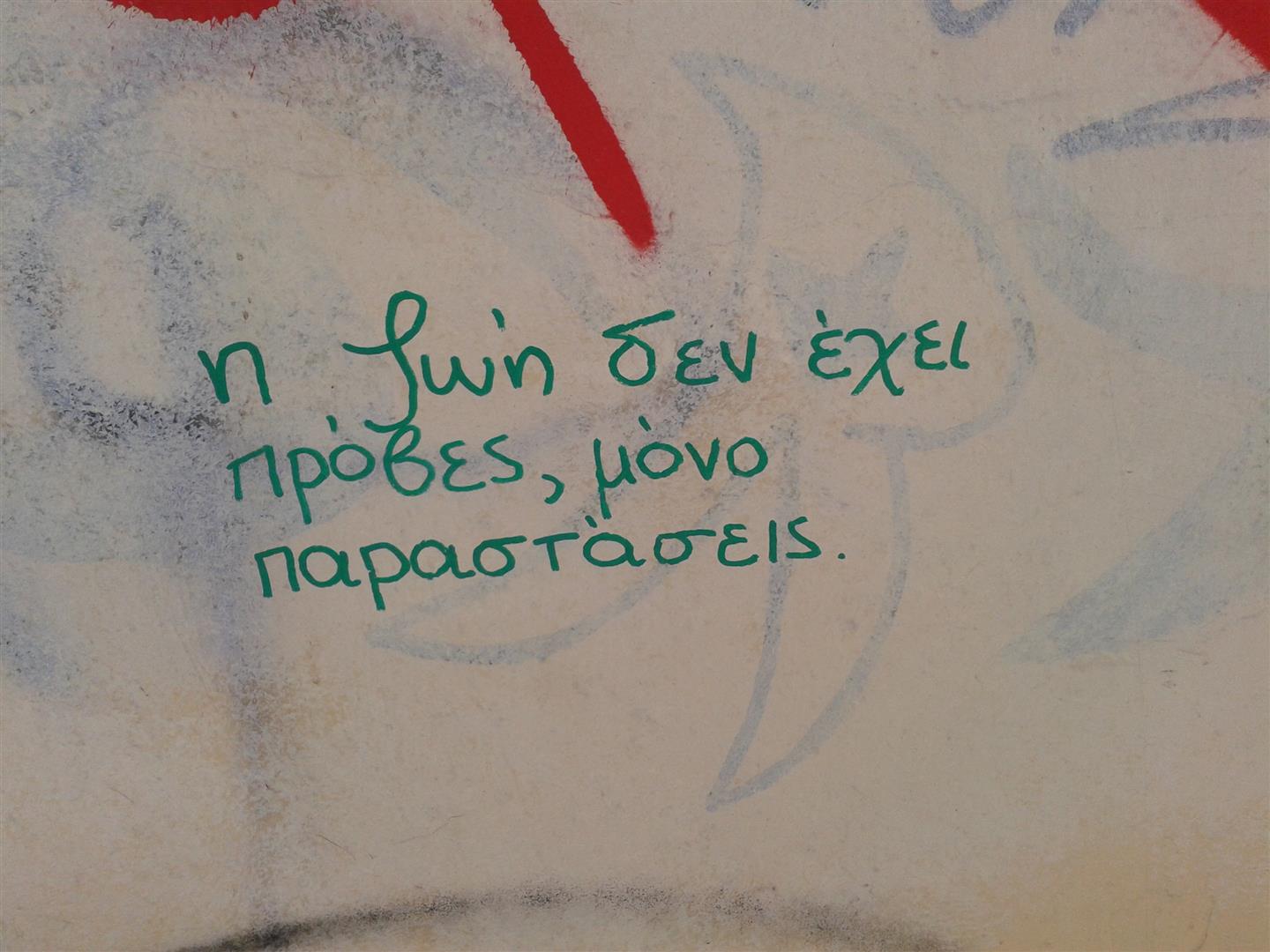 «Η ζωή δεν έχει πρόβες, μόνο παραστάσεις», συνεχίζουν στην πολυλογία τους οι τοίχοι της Π. Πόλης. Μεγάλη αλήθεια λέει κι ο τοίχος της οδού Χατζηγρηγοράκη λοιπόν, λίγο πιο κάτω από το «αγαπημένο», «Ζήσε όπως θέλεις και θα είναι ανεπανάληπτο», που «φιλοξενείται κάτω από την χαρακτηριστοκότατη ξύλινη καμαρούλα και το σπίτι από πάνω. Παραστάσεις ατελείωτες έχει η ζωή, στις οποίες δε συγχωρούνται λάθη, που θα μπορούσαν να διορθώνονταν στις πρόβες και από τις οποίες μόνο να μάθεις μπορείς, ώστε να γίνεις καλύτερος για τον εαυτό σου και τους γύρω σου. Απαραίτητη προϋπόθεση για αυτό; Να ζεις πραγματικά…