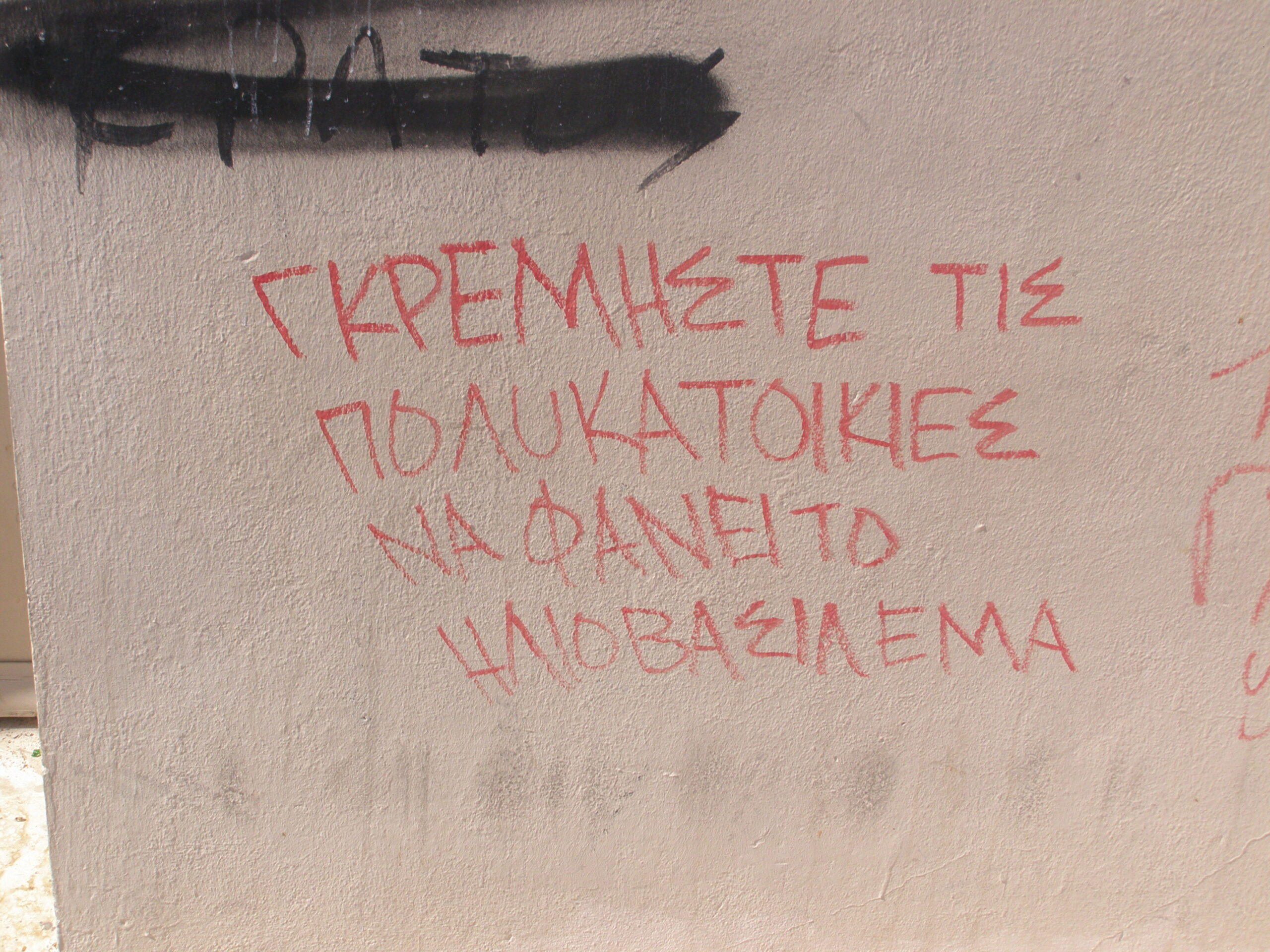 Ένα σύνθημα της «πολιτικής τέχνης» που επιβεβαιώνει το ότι «ο τοίχος είχε τη δική του ιστορία» και που σίγουρα μας έμεινε ανεξίτηλο, ήταν το εξής γραμμένο στην πλατεία Μικρασιατών, το οποίο σβήστηκε αρχικά και έπειτα «αντικαταστάθηκε» από τις κλασικές ακαλαίσθητες μουτζούρες: «ΓΚΡΕΜΙΣΤΕ ΤΙΣ ΠΟΛΥΚΑΤΟΙΚΙΕΣ ΝΑ ΦΑΝΕΙ ΤΟ ΗΛΙΟΒΑΣΙΛΕΜΑ». Ένα σύνθημα, αναρχικό και συνάμα, τόσο ρομαντικό. Στον αστικό πολιτισμό, κυριολεκτικά και μεταφορικά, οι πολυκατοικίες και τα διαμερίσματά τους αποτέλεσαν και αποτελούν το «κλουβί» του απομονωτισμού, της εσωστρέφειας και του ατομικισμού που αναφέραμε και παραπάνω, όπου μοναδικό διέξοδο αποτελούσε και συνεχίζει να αποτελεί το χαζοκούτι της τηλεόρασης, που μόνο «χαζό» δεν είναι. Η αγνότητα άλλων εποχών χάθηκε, οι γειτονιές επίσης έχασαν το χαρακτήρα τους, η έγνοια για το γείτονα και το συνάνθρωπο στις λεγόμενες κλειστές κοινωνίες έχει αποδειχτεί σε πολλές περιπτώσεις ότι ενεργοποιείται όταν πρόκειται για κουτσομπολιό, για αρνητικά και κατόπιν εορτής σχόλια. Οι νεότερες γενιές γαλουχούνται στο άγχος, τη φαινομενική ελευθεριότητα της εποχής και την εξοικείωση με τις νέες τεχνολογίες. Το «ηλιοβασίλεμα» πλέον για όσους έχουν παγιδευτεί στο «σύγχρονο» τρόπο ζωής αποτελεί ένα άγνωστο θέαμα…