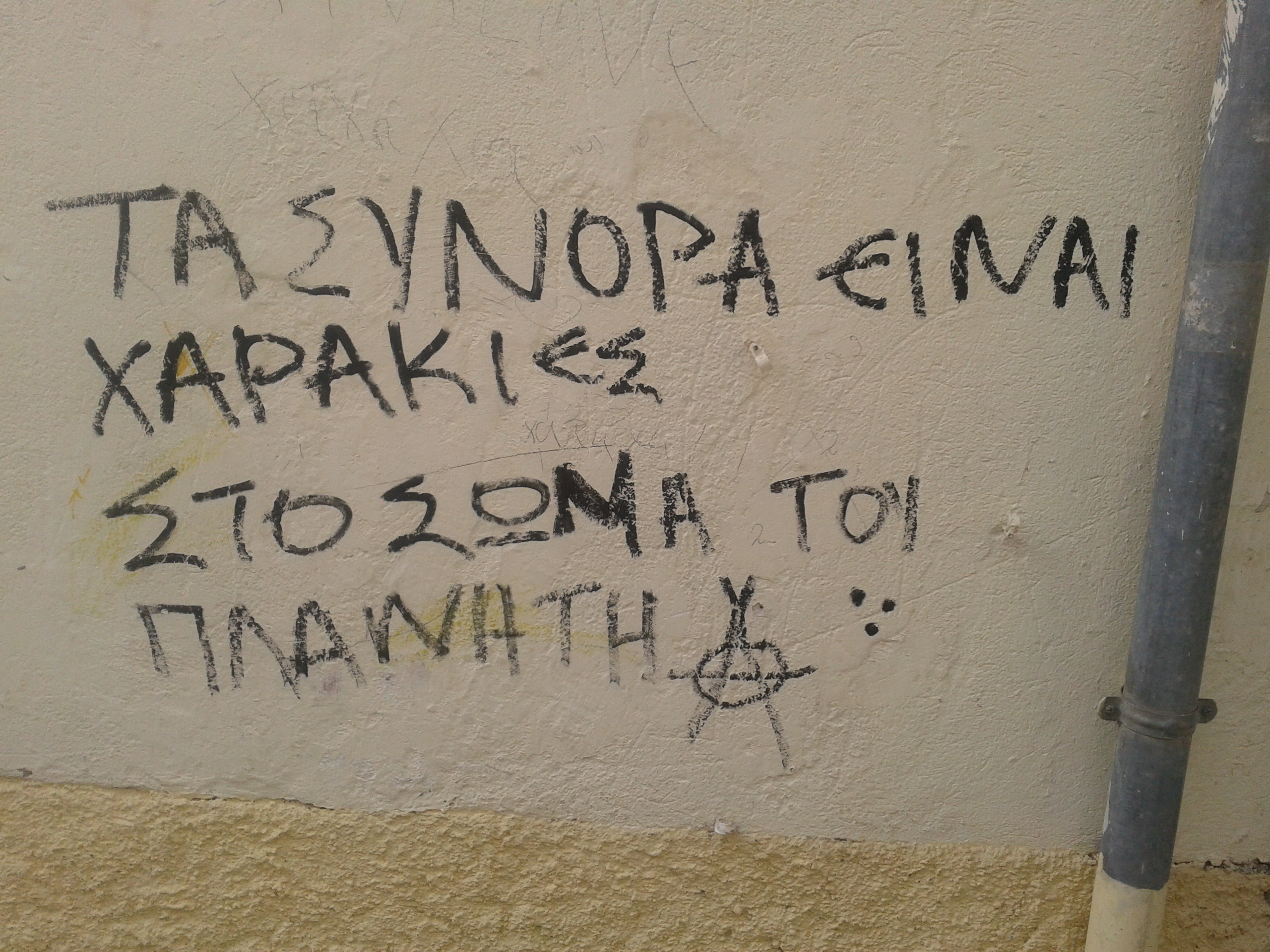 Τέλος, στην Παλιά Πόλη, που αναμφισβήτητα έχει τα πρωτεία σε ό, τι αφορά τα ευρηματικά πολιτικά και κοινωνικά μηνύματα σε τοίχους, κοντά στο 3ο δημοτικό και την Πατρ. Γρηγορίου, θα παρατηρήσει κανείς το εξής γραμμένο: «ΤΑ ΣΥΝΟΡΑ ΕΙΝΑΙ ΧΑΡΑΚΙΕΣ ΣΤΟ ΣΩΜΑ ΤΟΥ ΠΛΑΝΗΤΗ». Είναι χαρακιές και στα σώματα των ανθρώπων. Πρόκειται για ένα σύνθημα, μία τραγική αλήθεια, που επιβεβαιώνεται όσο ποτέ άλλοτε και στην ελληνική πραγματικότητα την περίοδο που διανύουμε. Νισάφι πια με το διαχωρισμό των ανθρώπων. Φτάνει πια η απόδοση ευθυνών για τα κακά της μοίρας μας, σε ανθρώπους που η δικιά τους κακή μοίρα τους έφερε εδώ, άλλους να εγκληματούν και άλλους να φυτοζωούν στο περιθώριο. Νισάφι πια με το εύκολο πέσιμο όλων μας στην παγίδα των «ολίγων». Ας καταλάβουμε ότι είμαστε όλοι άνθρωποι του πλανήτη Γη και ότι τα σύνορα υπάρχουν μόνο για να οριοθετούν εκτάσεις χωρών και όχι για να διαχωρίζουν ανθρώπους. Επιτέλους, ας μας γίνει αντιληπτό πως «σε ένα καζάνι βράζουμε»…