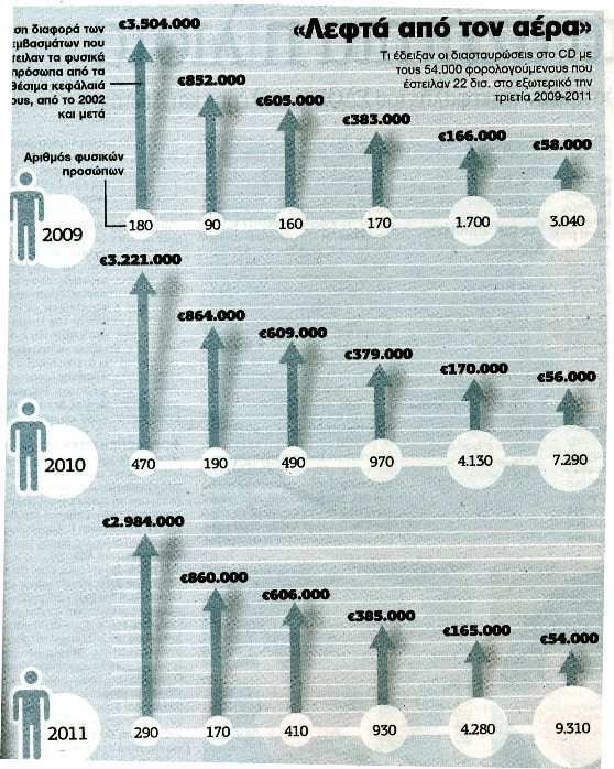 Όπως αποκαλύπτουν Τα Νέα, μέρος των αποτελεσμάτων των διασταυρώσεων στο CD με τα 54.000 φυσικά πρόσωπα που εξήγαγαν από τη χώρα πάνω από 22 δισ. ευρώ από το 2009 έως και το 2011 βρίσκεται πλέον στη διάθεση του ΣΔΟΕ.