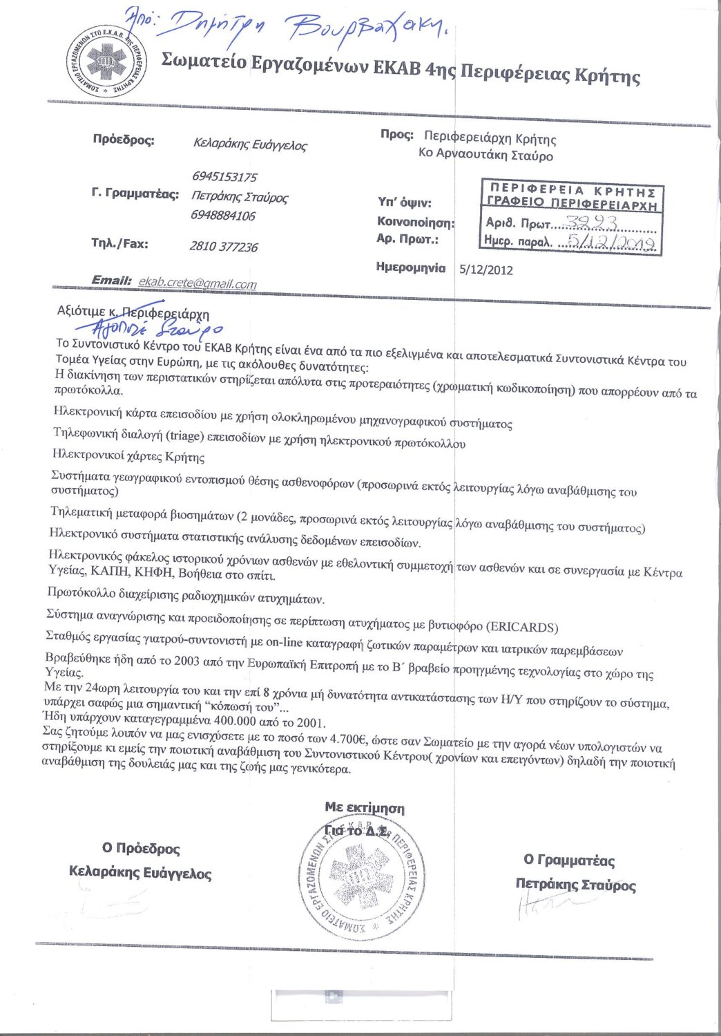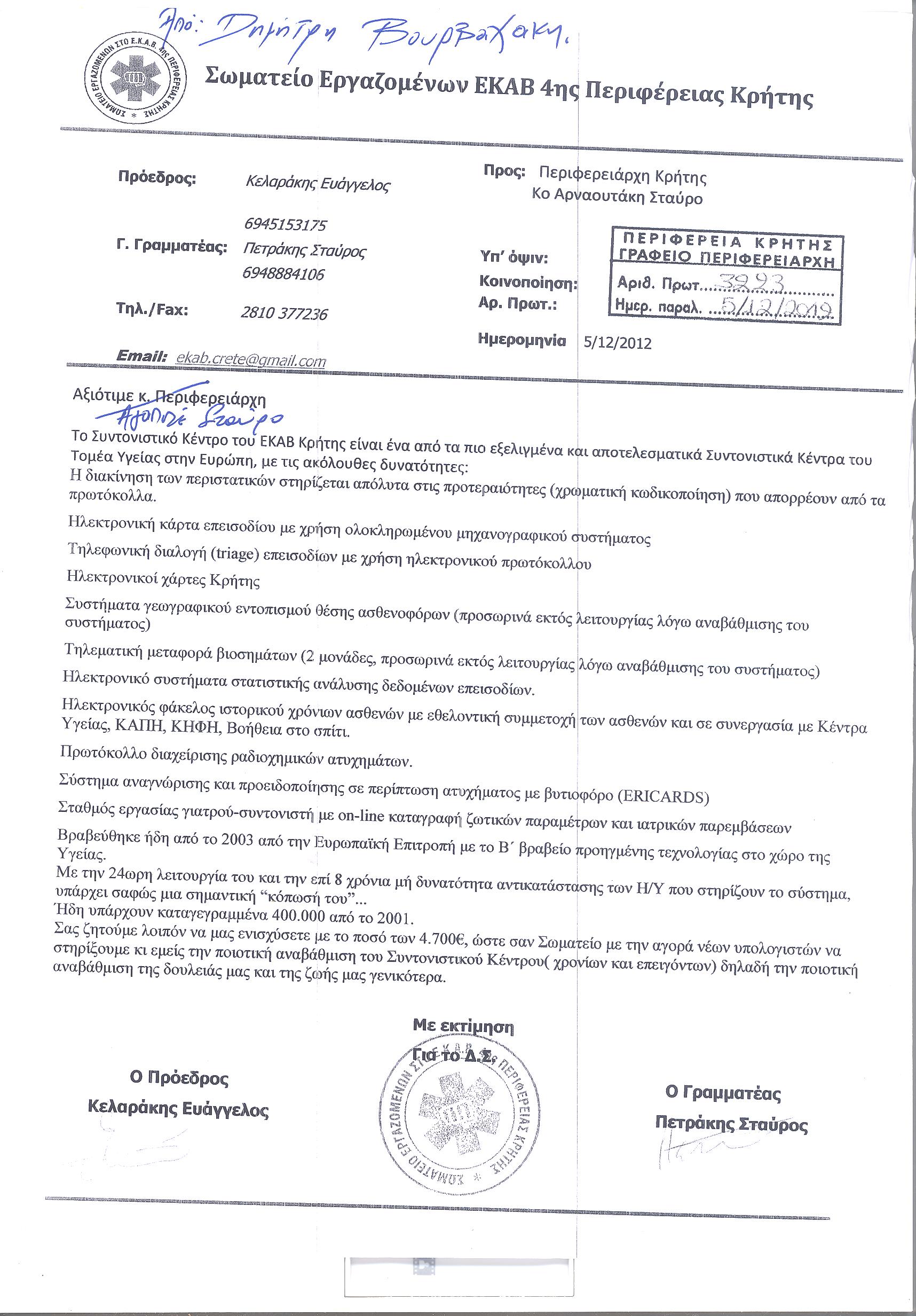 Ο Γενικός Διευθυντής του ΕΚΑΒ Κρήτης και ο Πρόεδρος του Σωματείου Εργαζομένων, αγωνίζονταν για την ποιοτική αναβάθμιση του Συντονιστικού Κέντρου της υπηρεσίας, προκειμένου το κοινωνικό έργο που επιτελεί, να εξακολουθήσει να βραβεύεται σε εθνικό και διεθνές επίπεδο προς όφελος και των κατοίκων του νησιού.