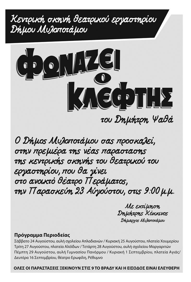 Την προσεχή Παρασκευή 23 Αυγούστου 2013 θα πραγματοποιηθεί η πρεμιέρα της νέας παραγωγής της Κεντρικής Σκηνής του Θεατρικού Εργαστηρίου του Δήμου Μυλοποτάμου, με το έργο του Δημήτρη Ψαθά «Φωνάζει ο Κλέφτης»!