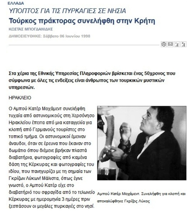 Όπως έγραφε στο άρθρο ο ανταποκριτής της εφημερίδας Κώστας Μπογδανίδης « Στα χέρια της Εθνικής Υπηρεσίας Πληροφοριών βρίσκεται ένας 50χρονος που σύμφωνα με όλες τις ενδείξεις είναι άνθρωπος των τουρκικών μυστικών υπηρεσιών. Ο Αμπού Κατέρ Μοχάμεντ συνελήφθη τυχαία από αστυνομικούς στη Χερσόνησο Ηρακλείου έπειτα από μια καταγγελία για κλοπή από Γερμανούς τουρίστες στο τοπικό τμήμα. Οι αστυνομικοί έμειναν άναυδοι, όταν σε έρευνα που έκαναν στο δωμάτιο όπου διέμενε βρήκαν πλαστά διαβατήρια, φωτογραφίες από καμένα δάση της Κέρκυρας και φωτογραφίες του ιδίου, που πανηγυρίζει με τη σημαία των Γκρίζων Λύκων! Μάλιστα, όπως έγινε γνωστό, ο Αμπού Κατέρ είχε στο διαβατήριό του σφραγίδα από το τελωνείο Κέρκυρας με ημερομηνία 3 ημέρες πριν ξεσπάσουν οι μεγάλες πυρκαγιές στο νησί.