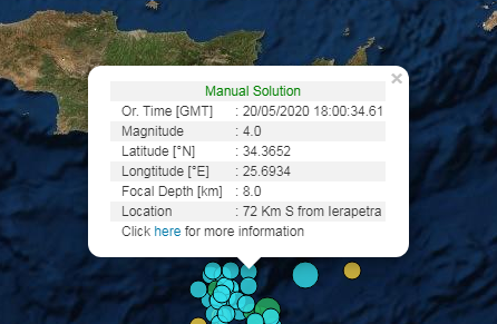 Το επίκεντρο εντοπίζεται στα 72 Χλμ. της Ιεράπετρας, ενώ το εστιακό βάθος μετρήθηκε στα 8 χιλιόμετρα.