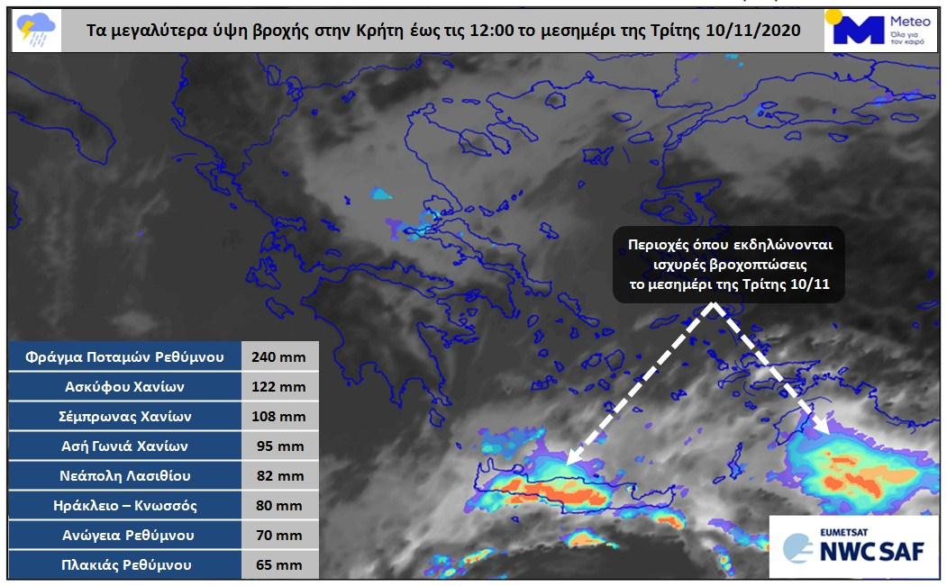 Πολύ ισχυρές τοπικά βροχοπτώσεις εκδηλώνονται στην Κρήτη το μεσημέρι της Τρίτης 10/11. Στην επεξεργασμένη δορυφορική εικόνα που ακολουθεί με έντονες αποχρώσεις επισημαίνονται οι περιοχές όπου εκτιμάται ότι εκδηλώνονται τα εντονότερα φαινόμενα. Ταυτόχρονα παρουσιάζονται τα οκτώ μεγαλύτερα ύψη βροχόπτωσης στο νησί, σύμφωνα με το Μετεωρολογικό και Υδρολογικό Παρατηρητήριο Κρήτης, έως τις 12:00 το μεσημέρι.