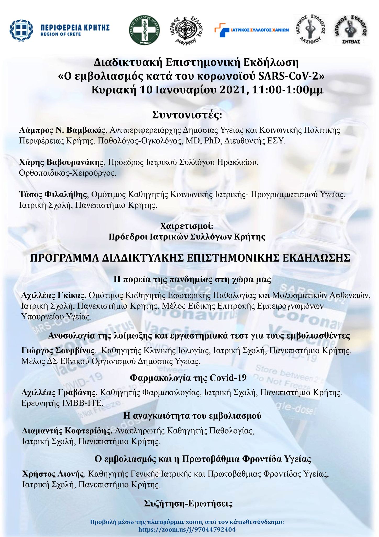11:30-11:45 Ανοσολογία της λοίμωξης και εργαστηριακά τεστ για τους εμβολιασθέντες Γιώργος Σουρβίνος. Καθηγητής Κλινικής Ιολογίας, Ιατρική Σχολή, Πανεπιστήμιο Κρήτης. Μέλος ΔΣ Εθνικού Οργανισμού Δημόσιας Υγείας.