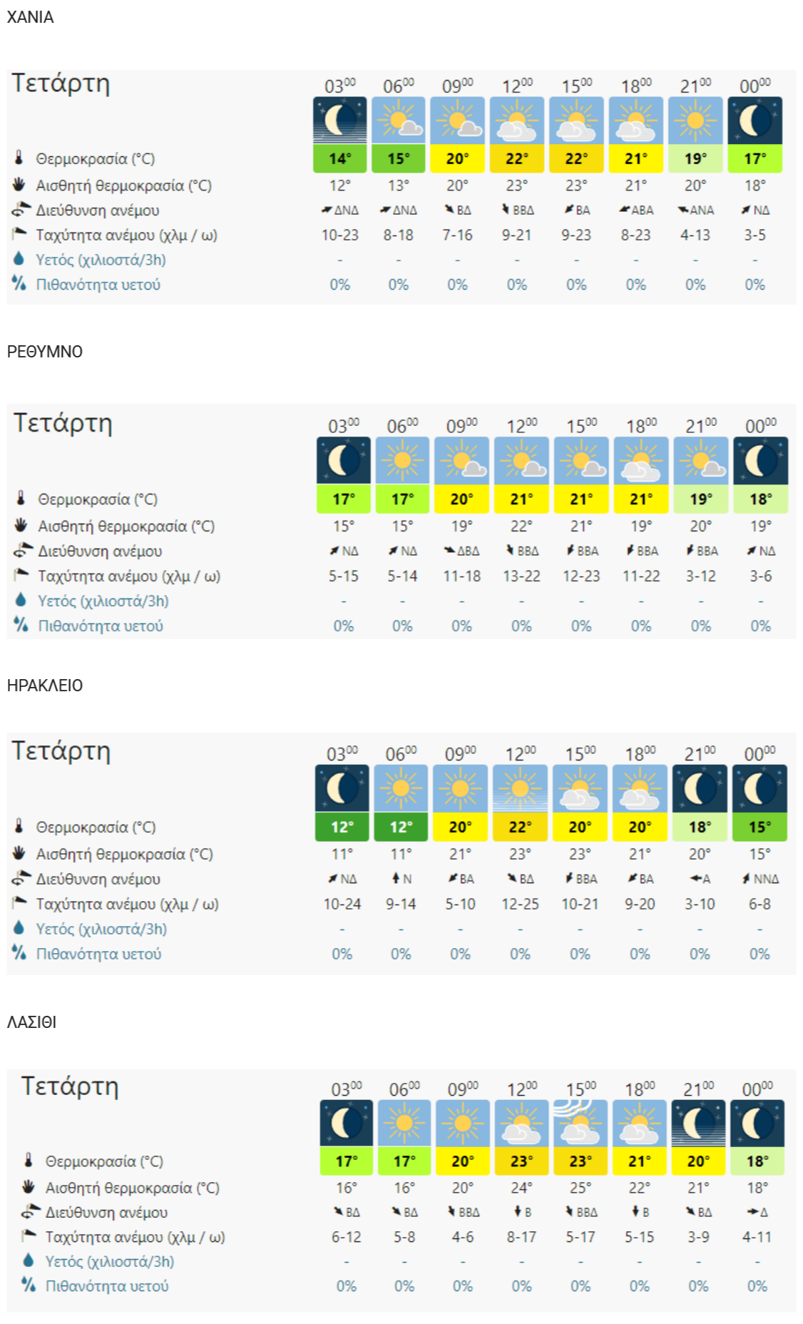 Η θερμοκρασία στη Δυτική Μακεδονία και στη Θράκη θα κυμανθεί από 7 έως 22 βαθμούς Κελσίου, στην Κεντρική Μακεδονία από 12 έως 26, στην Ανατολική Μακεδονία και στη Θράκη από 11 έως 21, στη Θεσσαλία από 13 έως 27, στην Ήπειρο από 9 έως 25, στη Στερεά Ελλάδα από 12 έως 26, στην Πελοπόννησο από 13 έως 26, στα νησιά του Ιονίου από 10 έως 24, στα νησιά του Βορείου και Ανατολικού Αιγαίου από 12 έως 25, στις Κυκλάδες από 11 έως 26, στα Δωδεκάνησα από 17 έως 25 και στην Κρήτη από 13 έως 27.