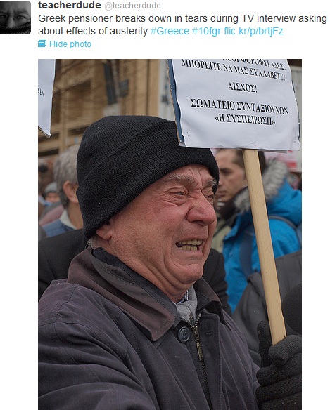 Και κάτω από την κραυγή διαμαρτυρίας, ο άνθρωπος που κρατά σφιχτά το μήνυμα του σωματείου συνταξιούχων »Συσπείρωση» (αυτό άλλωστε που χρειάζεται η Ελλάδα αυτές τις κρίσιμες στιγμές), λυγίζει, δακρύζει…